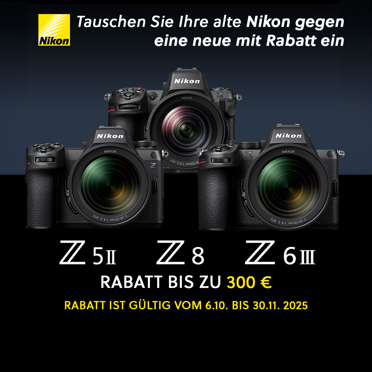 Von Montag, 6. Oktober 2025, bis Sonntag, 30. November 2025, läuft die Sonderaktion TRADE IN / TAUSCHEN SIE ALT GEGEN NEU für ausgewählte Nikon-Kameras.