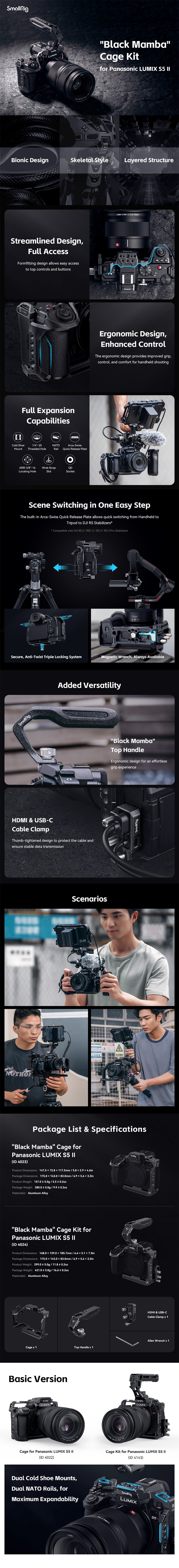 Der SmallRig "Black Mamba" Käfig für die Panasonic LUMIX S5 II / S5 IIX 4023 wurde zum Schutz der Kamera und zur Befestigung von Zubehör entwickelt. Die Kamera wird mit einer 1/4"-20 Schraube an der Unterseite und zwei seitlichen Verschlussadaptern befestigt. Gummipuffer verhindern Kratzer und der "Black Mamba"-Stil bietet vollen Zugang zu allen Bedienelementen an der Oberseite. Zu den Zubehörbefestigungspunkten gehören 1/4"-20-Löcher für den Seitenhandgriff 2093B, das vordere 1/4"-20-Aufnahmeloch für die Stabklemme 3276 für das nachfolgende Fokussystem und das ARRI 3/8"-16-Aufnahmeloch für den oberen Handgriff 3786 oder die Monitorhalterung 2903B. Außerdem verfügt es über eine linke NATO-Schiene für den Seitenhandgriff 3847, Kaltschuhhalterungen zur Befestigung eines Mikrofons und einer LED-Videolampe sowie eine QD-Buchse an der Unterseite zur Anbringung eines QD-Schultergurts. An der Unterseite befindet sich eine Arca-Swiss-Schnellwechselplatte, die für DJI RS 2 / RSC 2 / RS 3 / RS 3 Pro Gimbals und Arca-Swiss-Stative geeignet ist, sowie eine Gewindebohrung für eine Schnellwechselplatte (Riser Pad) von DJI RS 2 / RSC 2 und Arca-Type Quick Release Plate 3154. Der Artikel verfügt außerdem über Gurtlöcher an beiden Seiten und an der Unterseite, die mit dem Handgurt 3848, dem Schultergurt PSC2428 usw. kompatibel sind. Außerdem ist ein Magnetschlüssel für eine einfache Demontage und Montage enthalten.