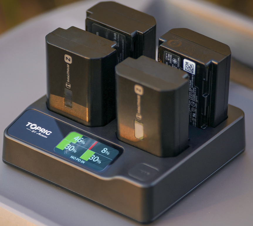 Das Accsoon TOPRIG ACC-BC-02 ist ein intelligentes 100-W-Ladegerät mit 4 Steckplätzen für Sony NP-FZ100-Akkus, das in nur 1,5 Stunden eine Ladung von bis zu 95 % liefert. Mit USB-C PD 3.0-Eingang, intelligenten Lademodi und einem integrierten Farbdisplay ist es für eine schnelle, sichere und professionelle Akkuverwaltung ausgelegt.