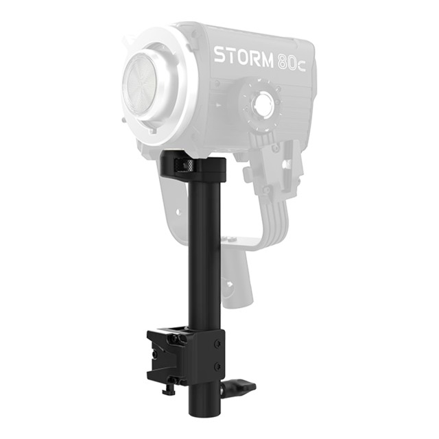 Der STORM 80c Lampenhalter ist an der Unterseite der Lampe befestigt. An der Unterseite des Griffs befindet sich eine V-Mount-Akkuplatte für das Gleichgewicht. Im Lieferumfang enthalten ist ein D-Tap zu 5,5 mm DC Barrel Stromkabel, das die Batterieplatte mit der STORM 80c verbindet. USB-C-Batterien können auch verwendet werden, um die STORM 80c zu betreiben. An der Unterseite der Halterung befindet sich ein Baby-Pin-Empfänger, der es ermöglicht, die Leuchte am Stativ zu befestigen, auch wenn der abnehmbare Bügel nicht angeschlossen ist.