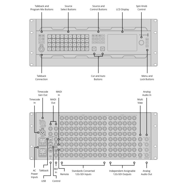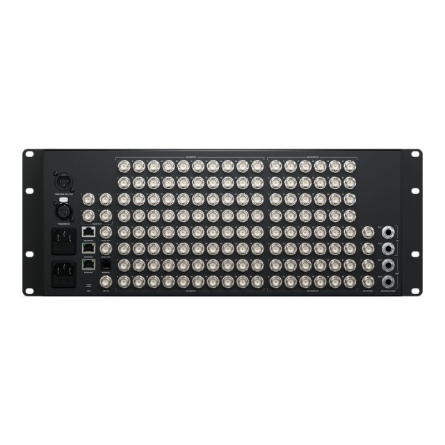 Jeder Geräteeingang ist mit einem separaten Konverter ausgestattet, so dass jeder SDI-Videoeingang in den Ausgangsstandard des Mähers umgewandelt werden kann. Es ist möglich, jeden SDI-Eingang des Umschalters in einem anderen TV-Standard zu betreiben - und sie funktionieren alle nahtlos. Sie können sogar Audio an mehrere digitale MADI-Ausgänge ausgeben, so dass Sie Audioquellen vom Mischer an einen externen Tontechniker zur separaten Mischung weiterleiten können.