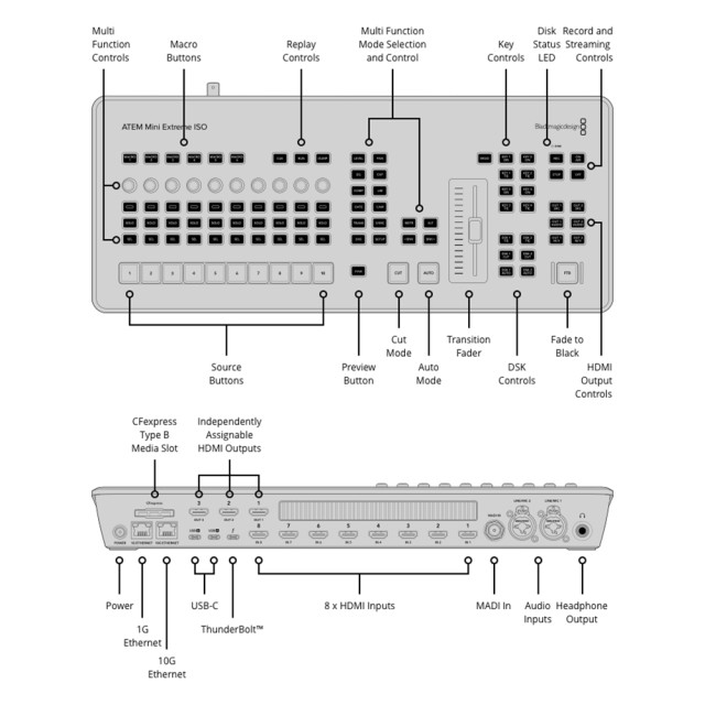 Der ATEM Mini Extreme ISO G2 ist eine Kombination aus Switcher und Bedienfeld. Auf der Vorderseite befinden sich Tasten zur Auswahl von Quellen, zum Auslösen von Übergängen und zum Einstellen von Videoeffekten. Außerdem gibt es einen manuellen Hebel für (Fader) Übergänge. Auf der Vorderseite befindet sich ein Kontrollbereich zum Mischen von Audio mit Live-Metering. Außerdem gibt es Tasten für die Aufnahme, das Streaming und separate Ausgangstasten, mit denen Sie zwischen 8 Kameras, Programm, Vorschau, Multiview oder Fairlight-Status wechseln können.