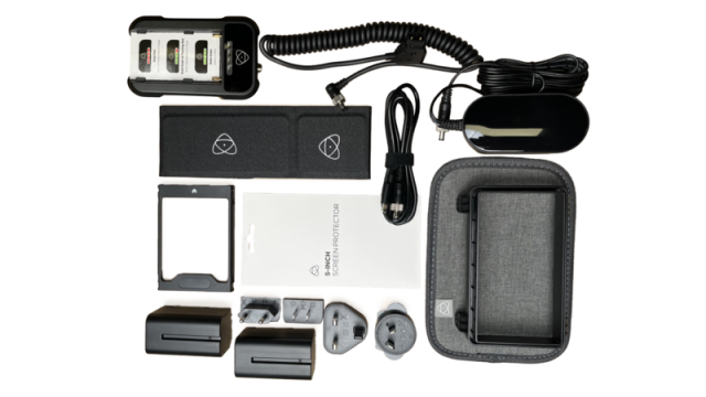 Das Atomos 5"-Zubehörkit für Ninja und SHINOBI enthält: Sonnenschutzdach, Bildschirmschutz, DC-Kabel, Schnellladegerät, zwei NP-F750 5200 mAh und eine EVA-Tasche