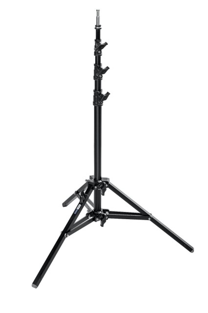 Eine Besonderheit ist sein einzelnes Nivellierbein, das auch auf unebenen Oberflächen einen stabilen Aufbau ermöglicht. Der Ständer wird mit einer 5/8" (16 mm) oberen Verlängerung geliefert, um kompatible Vorrichtungen einfach montieren zu können. Sein Basisdurchmesser von 87 cm sorgt für Stabilität, während Stahlbeine mit quadratischem Querschnitt für zusätzliche Steifigkeit sorgen. Mit einem Gewicht von nur 2,55–3 kg ist der A0025B leicht zu transportieren, und dank seiner Länge von 87 cm im zusammengeklappten Zustand lässt er sich bequem lagern und transportieren. Dieser Aluminiumständer ist für professionelle Studio- oder Außenaufnahmen gut ausgestattet und sowohl langlebig als auch vielseitig einsetzbar.