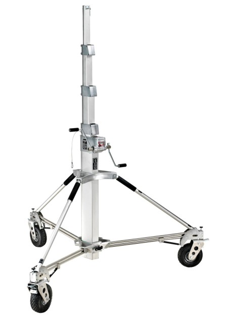 Der Ständer verfügt über ein winchbetriebenes Hebesystem mit 5 Abschnitten, das eine präzise und kontrollierte Anhebung der Ausrüstung auf eine maximale Höhe von bis zu 5,70–5,78 m ermöglicht. Er besteht hauptsächlich aus Stahl mit Aluminiumkomponenten und bietet außergewöhnliche Haltbarkeit bei gleichbleibend reibungsloser Hebeleistung. Das integrierte Luftfedersystem bietet zusätzlichen Schutz für die montierte Ausrüstung während der Höhenverstellung.