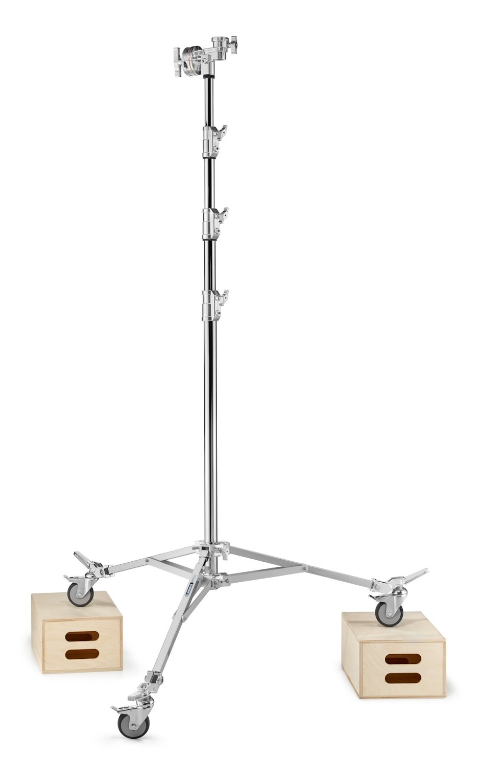 Der Ständer verfügt über einen integrierten Greifkopf, der Stützstangen, Rohre und Oberrahmen sicher hält und eine sichere und stabile Befestigung in der Höhe gewährleistet. Mit einer maximalen Tragkraft von 40 kg eignet er sich für schwere Anwendungen, einschließlich Überkopf-Butterfly-Rahmen und Beleuchtungsanlagen. Gebremste Räder ermöglichen eine einfache Neupositionierung am Set, ohne die Sicherheit zu beeinträchtigen. Der Ständer erreicht eine maximale Höhe von 4,32 Metern und eine minimale Höhe von 1,53 Metern und bietet somit Flexibilität für verschiedene Aufbauten. Ein breiter Sockeldurchmesser von 154 cm und quadratische 25 x 25 mm Beine sorgen für hervorragende Stabilität, während ein verstellbares Bein eine korrekte Nivellierung auf unebenen Oberflächen ermöglicht.
