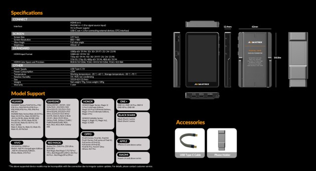 AVMatrix Vlog Selfie Monitor. 3×Typ-C-Anschlüsse; USB-C-Ausgang unterstützt OTG-Funktion zum Anschluss von USB-Zubehör wie Aufhellungsleuchten und liefert Strom. Kompatibel mit den meisten Flaggschiff-Smartphones mit voll funktionsfähigen Typ-C-Anschlüssen; unterstützt 1080p-HDMI-Eingang. 3,97-Zoll-Bildschirm mit Echtzeit-Dual-Screen-Interaktion.