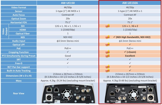Die UE150A-Kamera verfügt über einen hochempfindlichen 1.0-Sensor und bietet einen großen Dynamikbereich für sanfte Abstufungen und hohe Videoqualität. Die wichtigste Neuerung ist ein verbesserter optischer Bildstabilisator (OIS) mit internen Mechanismen zur Verringerung von Bildruckeln bei Schwenk- und Neigebewegungen und verbesserter Synchronisierung der voreingestellten Schwenk-, Neige- und Zoompositionen für sanftere und natürlichere Kamerabewegungen.