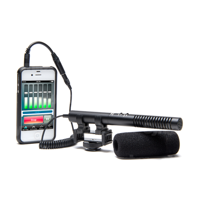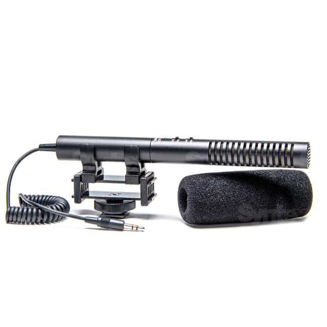 Gewehrmikrofon mit umschaltbarer Richtcharakteristik für kleine Kameras/DSLRs/DSLMs und Telefone/Tablets (mit beiliegendem TRRS-Reduzierer)