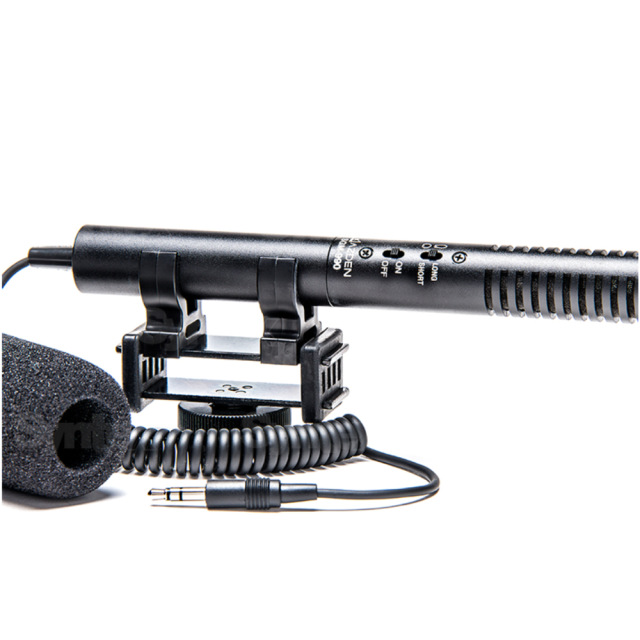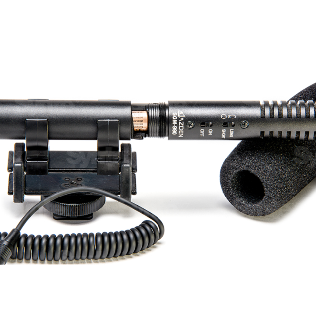Das Azden SGM-990+i ist ein 15-cm-Gewehrmikrofon mit umschaltbarer Richtcharakteristik, das für DSLR/DSLM-Kameras (3,5-mm-Buchse) und mobile Geräte (kompatibel mit dem mitgelieferten TRRS-Reduzierer, Kompatibilitätstabelle hier) entwickelt wurde. Einzigartig ist die Möglichkeit, zwischen schmaler und breiter Richtcharakteristik umzuschalten - der "Long"-Modus ist für die Aufnahme von Schall aus größerer Entfernung und großer Schallunterdrückung von den Seiten, der "Short"-Modus mit Nierencharakteristik ist für die Aufnahme aus kürzerer Entfernung. Beide Modi bieten eine gute Schallunterdrückung von der hinteren Halbkugel und von den Seiten