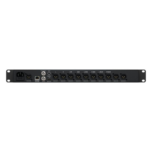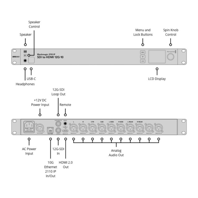 Der Blackmagic 2110 IP SDI to HDMI 12G-10 verfügt über zehn analoge XLR-Audioausgänge für Surround-Sound-Monitoring, die eine ferngesteuerte Lautstärkeregelung und eine einstellbare Verzögerung ermöglichen - ideal für die Anpassung an den Ton von Fernsehern und Projektoren. Das Gerät verfügt über variable Verstärkung und Verzögerung für eine perfekte AV-Synchronisation und 3D-LUTs für eine genaue Farbkalibrierung von HDMI-Displays. Das Gerät verfügt über ein frontseitiges LCD-Display mit Videovorschau, Audiopegel und Menüs sowie über einen Lautsprecher- und Kopfhörerausgang.