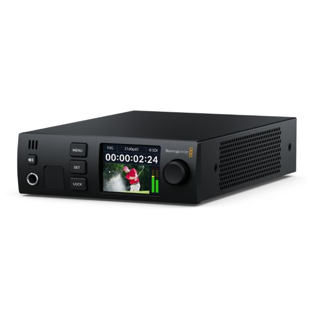 Dieses Modell wurde entwickelt, um die Verwendung der neuesten OLED-Fernseher für eine genaue Farbüberwachung zu ermöglichen, zum Beispiel in Farbkorrektur- und Schnitträumen. Der Blackmagic 2110 IP SDI to HDMI 12G verfügt über zwei analoge XLR-Audioausgänge für die Überwachung, die eine ferngesteuerte Lautstärkeregelung und benutzerdefinierte Verzögerungseinstellungen für den Anschluss aktiver Lautsprecher ermöglichen. Er verfügt über eine variable Verstärkung und Verzögerung für eine perfekte AV-Synchronisation und 3D-LUTs für eine genaue Farbkalibrierung von HDMI-Displays. Das Gerät verfügt über ein frontseitiges LCD-Display mit Videovorschau, Audiopegeln und Menüs sowie über einen Lautsprecher- und Kopfhörerausgang.