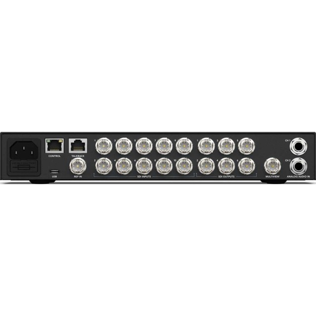 Die Kunden können Geräte in HD- oder Ultra HD-Fernsehstandards anschließen, darunter die Formate 720p, 1080i, 1080p und 2160p. Die SDI-Eingänge können auch eingebettetes Audio verarbeiten und Audio von allen Videoeingängen mischen. Die Programmausgänge umfassen Talkback-, Tally- und Kamerasteuerungsinformationen. Der Kunde kann also jeden beliebigen SDI-Ausgang des Mähers an die Kamera für Programmrücklauf, Kamerasteuerung und Talkback anschließen.