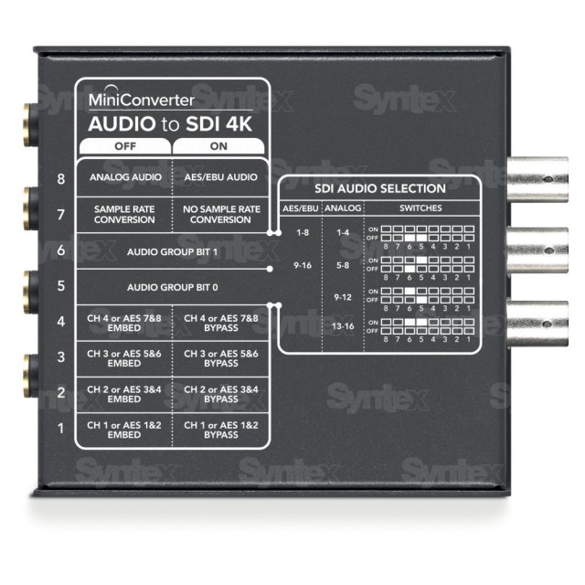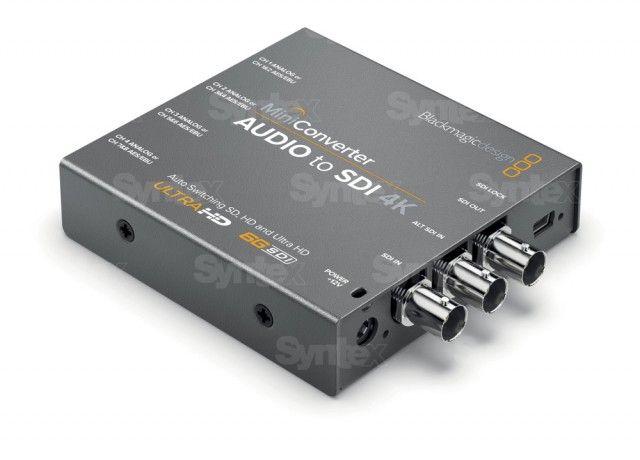 Mit dem Mini Converter Audio to SDI 4K können Sie vier analoge Audiokanäle oder acht digitale AES/EBU-Audiokanäle in ein SDI-Signal einbetten. So können Anwender problemlos Audio von Mischpulten oder analogen Videorekordern in das SDI-Signal einbetten!