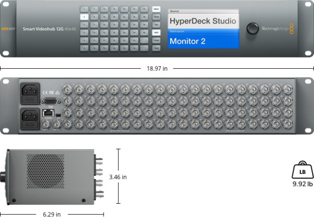 Neben einer hochmodernen 12G-SDI-Schnittstelle bietet der Blackmagic Smart Videohub 12G 40x40 vollständige Bedienelemente auf der Vorderseite, zwei Netzteile, Ethernet-Fernsteuerungsmöglichkeiten, einen RS-422-Anschluss oder Sync I/O. Die Fernsteuerung über Ethernet-Netzwerke erfolgt über Blackmagic Design Router Control oder über Blackmagic Smart Control und Master Control Hardware-Bedienfelder