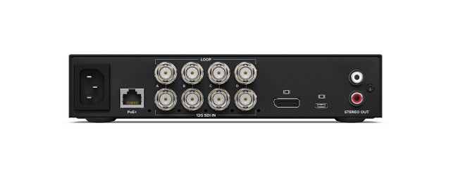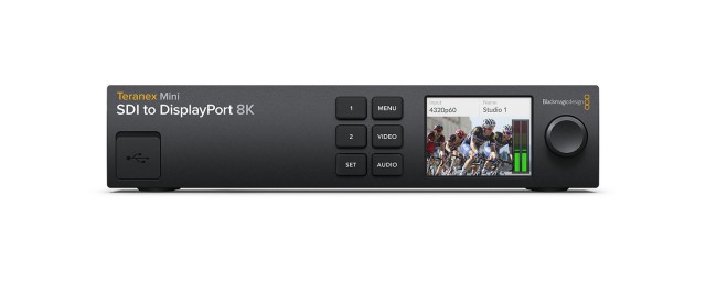 Auf der Frontmaske befinden sich Bedienelemente und ein Farbdisplay zur Anzeige des am Videoeingang anliegenden Signals, Audioanzeigen und eine Videoformatanzeige. Die Rückseite bietet eine Quad Link 12G-SDI-Schnittstelle, die mit den Standards HD, Ultra HD und 8K kompatibel ist. Außerdem gibt es zwei DisplayPort-Anschlüsse: einen Standard- und einen USB-C-Anschluss für neue Monitore wie den Pro Display XDR. Eine integrierte Funktion zur Änderung der Videoauflösung stellt sicher, dass das richtige Videosignal für einen an die DisplayPort-Schnittstelle angeschlossenen Monitor vorhanden ist.