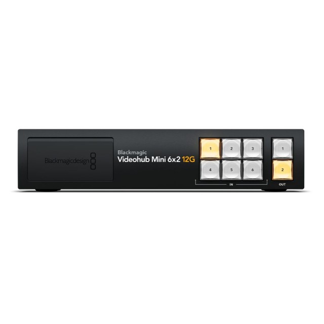 Der Blackmagic Videohub Mini 6x2 12G ist ein kompakter, latenzfreier Video-Router, der jede Kombination von SD-, HD- und Ultra HD-Signalen gleichzeitig unterstützt.