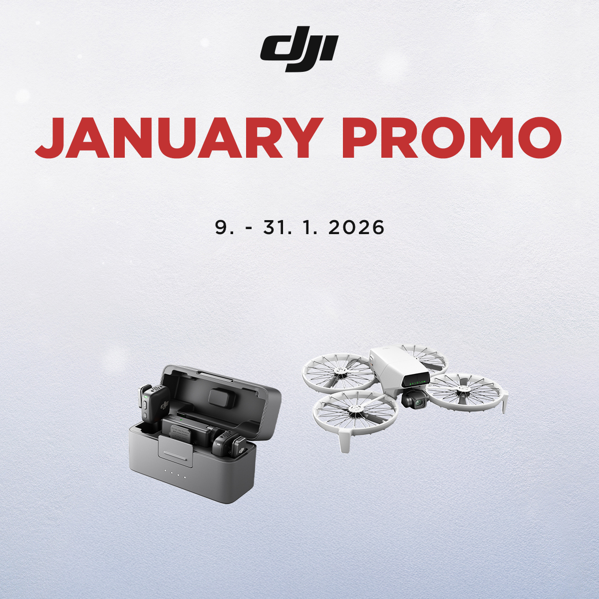 Vom 9. bis 31. Januar 2026bieten wirIhnennachund nachRabatte auf vier Produktgruppenvon DJI. Dank dieser Aktion können Sie nicht nur hochwertigeDrohnen undStabilisatorenfürMobiltelefone, sondern auchActionkameras oder Mikrofone von DJI miteinem Rabatt von bis zu 36 % erwerben!