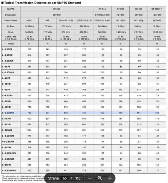 Spezielle 12G-SDI-Koaxialverkabelung (SMPTE 2082-1). Dämpfung 39,1 dB/100 m @ 6 GHz bei 7,7 mm Durchmesser und 7,1 kg/100 m Gewicht. Impedanz 75 Ohm, Kapazität 52 pF/m. Kann 12G-SDI-Signale über Entfernungen von bis zu 102 m übertragen (abhängig von der verwendeten Technologie). Preis pro 1 m.