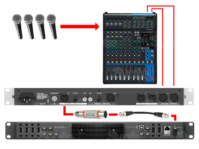umwandelt. Diese Lösung ist ideal für den Einsatz in Postproduktions-, DAT- und Aufnahmestudios. Der Vorteil besteht darin, dass im Vergleich zu Twisted Pair 110Ω längere Kabelstrecken verwendet werden können und ein hervorragender Schutz gegen Brummen und Rauschen besteht.Anwendungen