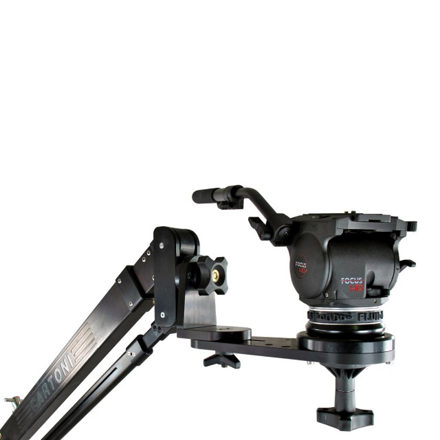 Der hintere Teil des Arms, der die Gegengewichte trägt, ist ausziehbar, um die Kamera genau auszubalancieren; das typische Gegengewichts-Set besteht aus 25 kg gummierten Turnhallengewichten.Der vordere Teleskoparm ermöglicht es dem CARTONI JIBO, in einer Vielzahl von Aufnahmepositionen oder -anforderungen zu arbeiten. Der Fluidkopf, der die Kamera trägt, kann in mehreren verschiedenen Positionen positioniert werden, wie z. B. unter dem Arm, seitlich, usw