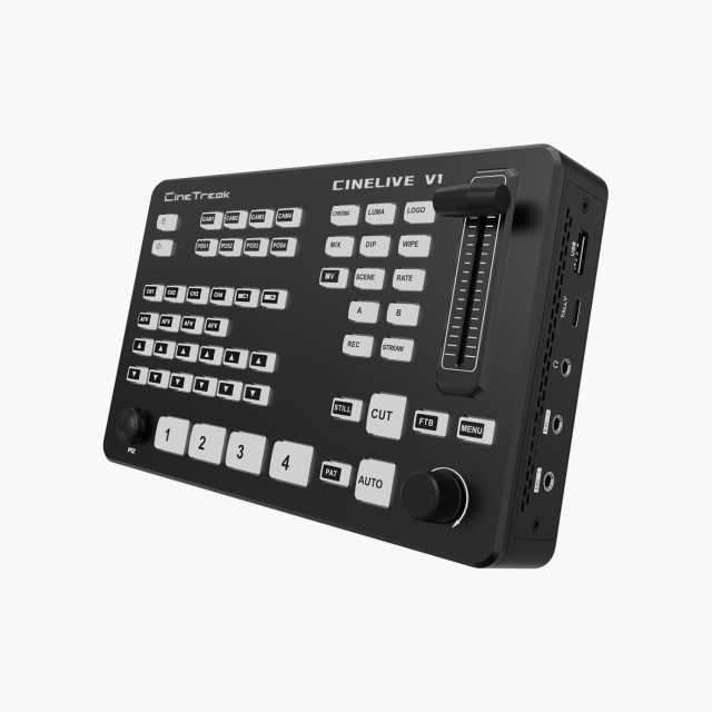 Der CineTreak Cinelive V1 ist ein vielseitiger Multikamera-Livestream-Switcher mit 4 HDMI-Eingängen, professionellem Chroma-Keying, PTZ-Steuerung, UVC-Ausgang und RTMP-Unterstützung - ideal für Live-Produktionen, Streaming und Event-Übertragungen.