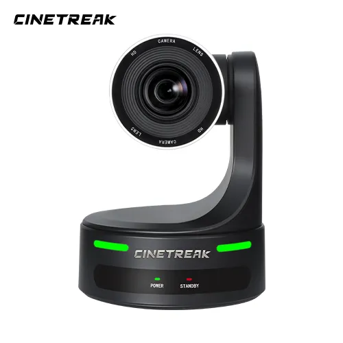 Die CineTreak CT-PT12 NDI ist eine leistungsstarke Full-HD-PTZ-Kamera (Schwenk-Neige-Zoom), die mit einem 1/2,8-Zoll-CMOS-Sensor ausgestattet ist und Videos mit bis zu 1080p60 aufzeichnen kann. Sie verfügt über einen 12-fachen optischen und 16-fachen digitalen Zoom, der scharfe und detailreiche Aufnahmen auch aus größerer Entfernung ermöglicht, sowie über eine automatische Verfolgung für eine nahtlose Motivverfolgung ohne manuelle Bedienung.