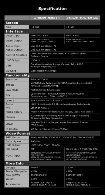 Mit PTZ-Kamerasteuerung (bis zu 4 Kameras über VISCA), drahtlosem IP-Betrieb und dualem RTMP-Streaming bietet der Stream Master umfassende Flexibilität. Seine Chroma- und Luma-Keying-Tools ermöglichen virtuelle High-End-Studioumgebungen, während PIP/POP-Overlays individuelle Multikamera-Layouts ermöglichen.