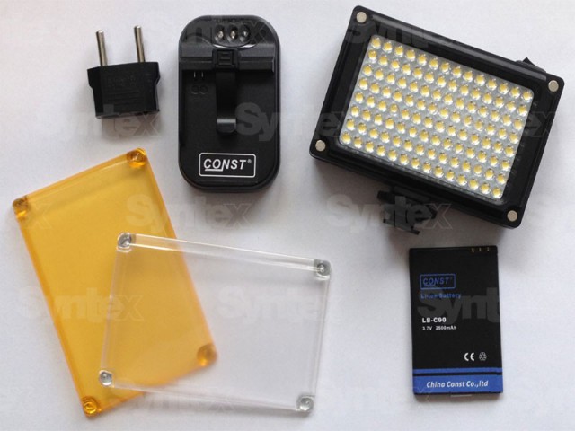 Die LED-Kameraleuchte EK90 wird Sie nicht nur mit ihrem sehr niedrigen Preis, sondern auch mit ihrer Leistung (bis zu 600 Lux bei einer Entfernung von 100 cm), ihrem geringen Gewicht (130 g) und ihren sehr kompakten Abmessungen (100x70x30 mm) angenehm überraschen. Sie erzeugt Licht mit einer Farbintensität von 5.600 K (kann mit dem mitgelieferten Amber-Filter auf 3.200 K geändert werden) und einer hohen Lichtstabilität. Es wird mit einer Spannung von bis zu 4,2 V bei einer Leistungsaufnahme von ca. 7 Watt betrieben. Neben der Leuchte selbst befinden sich in der Verpackung ein 3,7-V-Li-Ionen-Akku, ein Ladegerät und zwei austauschbare Filter (Weichzeichner und Amber)