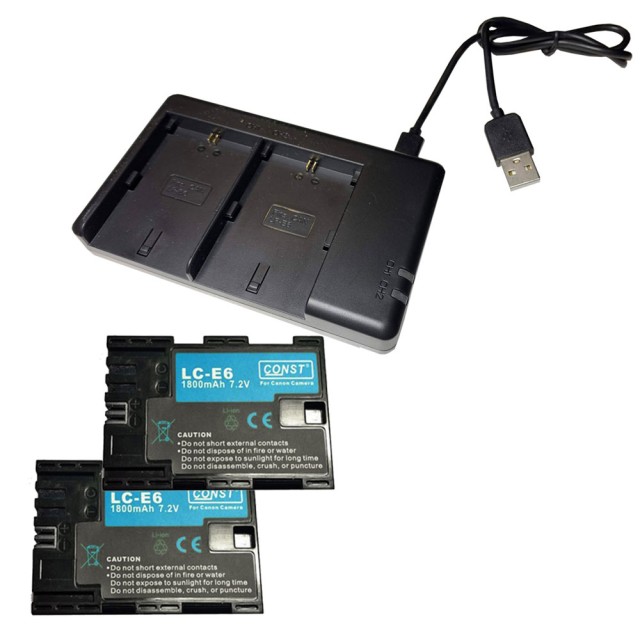 2 Stück CONST LC-E6 (LP-E6), 7.2V 1800mAh Akkus und CONST C-2E6 Zweikanal-Ladegerät