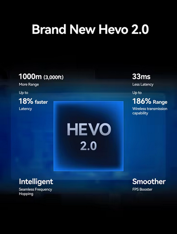 Der Cosmo C2 arbeitet mit der HEVO 2.0-Technologie, die eine reibungslose Übertragung mit geringer Latenz (≥33ms) gewährleistet, indem sie automatisch die beste Frequenz erkennt und umschaltet, um Störungen zu vermeiden. Das System kann Videosignale in offenen Bereichen bis zu 1000 Meter weit übertragen und ist damit eine hervorragende Lösung für Live-Events, Sportübertragungen und groß angelegte Produktionen.