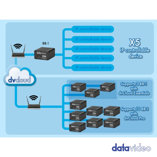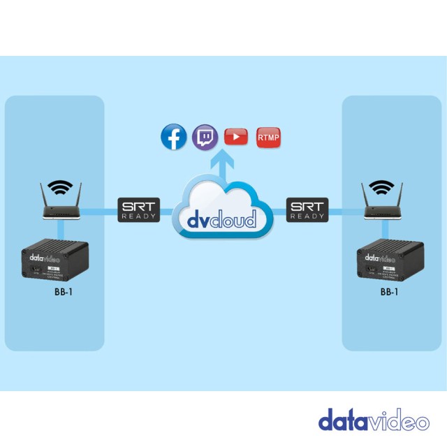 BB-1 KIT, mit dem Kunden von jedem Ort der Welt aus Fernproduktionen erstellen können. Der BB-1 ermöglicht den Fernzugriff auf Datavideo-Geräte über das Internet und fungiert als DHCP-Server, der allen angeschlossenen Geräten automatisch virtuelle IP-Adressen in der Cloud zuweist. Zusammen mit einem dvCloud-Streaming-Abonnement kann jedes BB-1-Gerät bis zu fünf Datavideo-Geräte verwalten, die an das Netzwerk angeschlossen sind. Der dvCloud Essentials-Abonnementdienst unterstützt ein Paar BB-1-Geräte und der dvCloud Professional unterstützt sechs BB-1-Geräte, so dass bis zu 25 Geräte ferngesteuert werden können. Ein dvCloud-Abonnement verwaltet Streams für bis zu fünf Ziele pro Kanal, wobei die Professional-Version bis zu fünf Kanäle unterstützt.