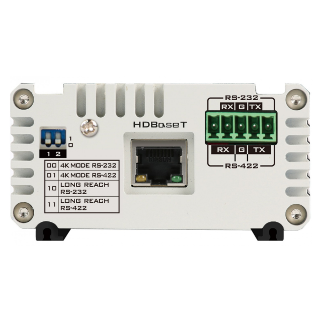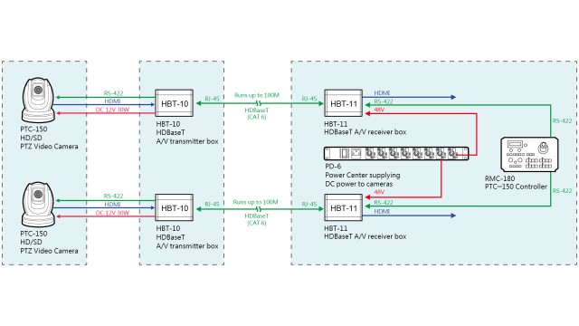 Empfänger für PTZ-Kameras (PTC-140T/150T) mit HDBaseT-Schnittstelle. Ermöglicht die Übertragung von Video, Audio, DVIP-Befehlen (RJ-45), RS-422/232-Befehlen (Phoenix-Schnittstelle) und PoE-Strom über ein einziges Cat.5e/6/6a/7-Kabel über eine Entfernung von bis zu 100 m im FHD-Modus. HDMI-Ausgang mit Unterstützung für die Formate 3840x2160p30/29.97/25/24/23.98, 1080p60/59.94/50/30/29.97/25/24/23.98, 1080i60/59.94/50, 720p60/59.94/50. Inklusive 48V= Netzteil und Phoenix > RJ-45 Reduzierstück.