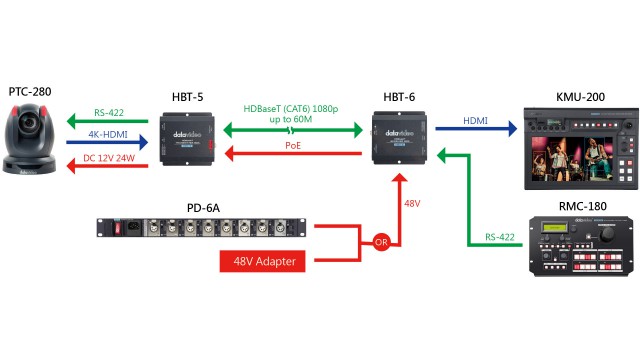 Transmitter für HDBaseT-Schnittstelle zur Übertragung von HDMI-Signalen über Entfernungen von bis zu 60 m in 1080p oder 35 m in 4K@30 mit Cat 6-Kabel. Unterstützt HDMI Deep Colour und Full 3D, Auflösung bis zu 4K/2K@30, HDCP 2.2/1.4, DTS-HD Master Audio und Dolby TrueHD Audio etc. Er unterstützt auch Power-over-Ethernet (PoE) und RS-232/RS-422-Befehle. Wird mit 48V= Stromversorgung geliefert.