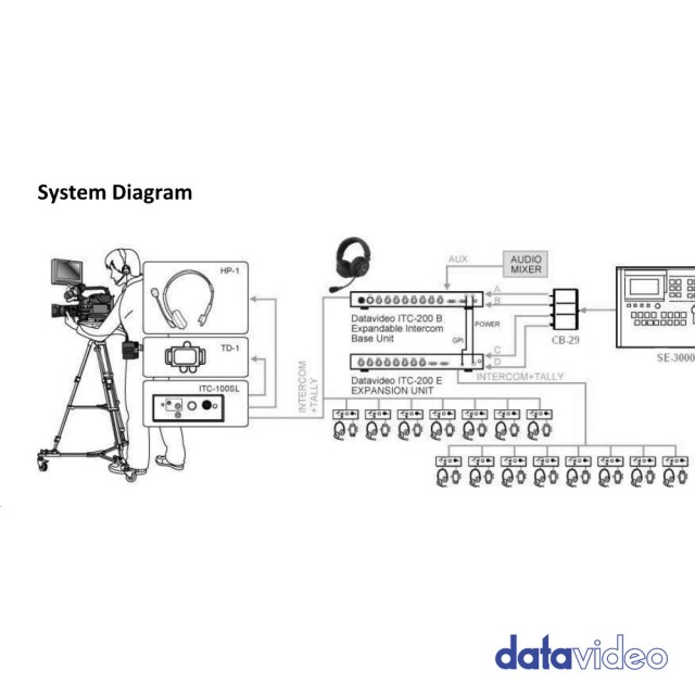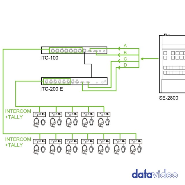 Der ITC-200E erweitert das Datavideo ITC-100 Tally/Talkback-System um 8 zusätzliche Kanäle. Mit dieser ITC-100/ITC-200E-Kombination erhalten Sie effektiv ein 15-Kanal-System. Die Kombination ITC-100/ITC-200E ermöglicht es dem Bediener, mit den Kanälen 1-7 separat und mit den anderen 8 als Gruppe oder mit allen 15 Kanälen gleichzeitig zu sprechen.