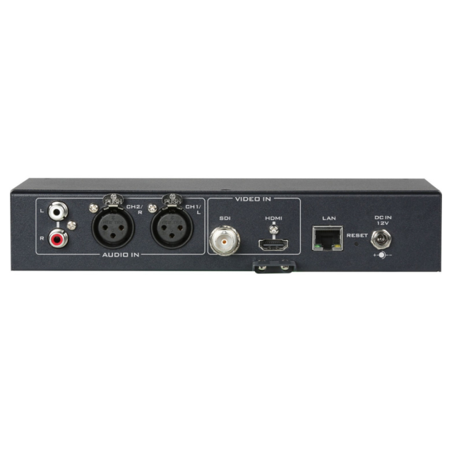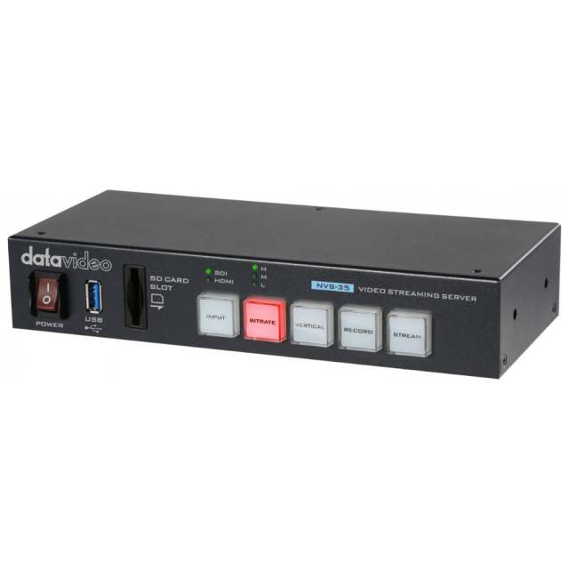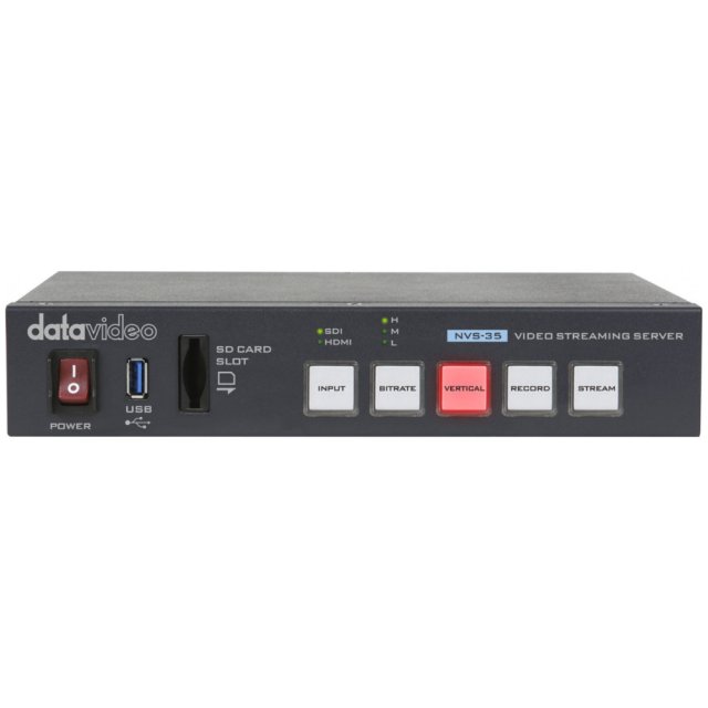 Der Datavideo NVS-35 H.264 Video Streaming Server ist ein leistungsstarker Live-Streaming-Encoder, der auch als professioneller Videorekorder eingesetzt werden kann. Die umfangreiche Eingangsschnittstellenkonfiguration unterstützt HDMI oder SDI Videoeingang; der Audioeingang bietet XLR symmetrischen oder RCA unsymmetrischen Eingang. Der Audioausgang ist als eingebettete Audioquelle, externe Audioquelle oder gemischte Audioquelle für die Kompatibilität mit einer Vielzahl von Produkten verfügbar. Der NVS-35 kann gleichzeitig live streamen und im H.264-Format aufzeichnen und auf verschiedene Bitraten für unterschiedliche Anwendungen und Netzwerkumgebungen eingestellt werden, um die beste Videoqualität zu erzielen.
