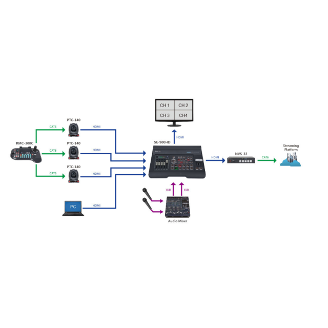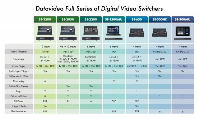 Die kompakte Kombination aus einem Vier-Kanal-Overhead und dem Datavideo SE-500HD Steuerpult ermöglicht die Verarbeitung von Signalquellen mit Auflösungen bis zu 1080p, einschließlich der Möglichkeit, verschiedene Auflösungen zu kombinieren. Trotz des geringen Anschaffungspreises bietet er auch Keying-Funktionen (Luma), einen Bild-in-Bild-Effekt oder Split-Screen zur Realisierung von z.B. Podcast-Interviews. Außerdem gibt es einen integrierten Soundmixer oder einen Multiview-Ausgang (einschließlich vier Videos im Hochformat)
