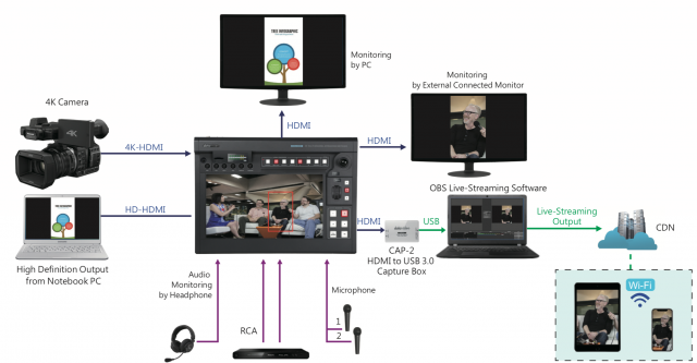 Der zusätzliche HDMI-Eingang bietet die Möglichkeit, einen zusätzlichen Kamerawinkel zu zeigen oder den Display-Ausgang eines Computers für eine Präsentationssoftware an das KMU-200 anzuschließen.