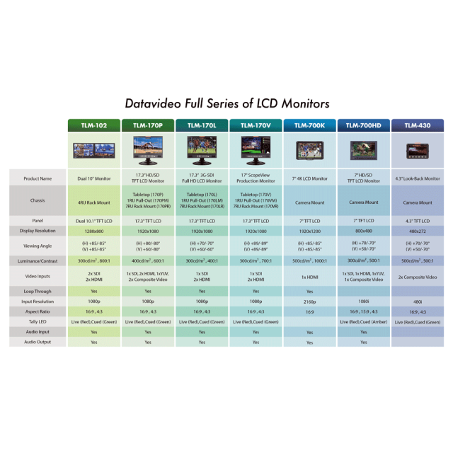 Der TLM-170L Monitor von Datavideo ist für überragende Leistung ausgelegt. Ganz gleich, ob Ihre Anwendung in einer Live-Produktionsgalerie, einem 19''-Rack-Monitoring, einem Ü-Wagen oder einem Videoschnittplatz liegt, der TLM-170L wird Ihnen helfen, die Bilder innerhalb des von Ihnen gewählten Workflows sicher zu überwachen. Um das Gerät optimal nutzen zu können, nehmen Sie sich bitte ein paar Minuten Zeit, um dieses Handbuch gründlich zu lesen