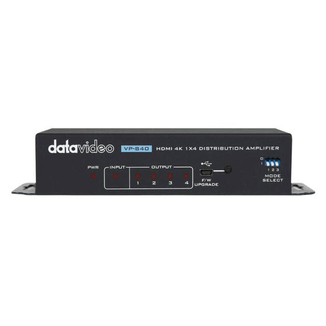 Der Datavideo VP-840 ist ein HDMI 1x4 Verteilerverstärker, der die Möglichkeit bietet, HDMI-Quellen an 4 Displays gleichzeitig zu wiederholen. Der VP-840 unterstützt eine Datenrate von bis zu 18 Gpbs und Auflösungen von 4K2K@60Hz, und ist konform mit HDMI 2.0 und HDCP 2.2. Der VP-840 verfügt über eine EDID-Verwaltung mit Auto-Downscale-Funktion, so dass mehrere EDID-Optionen für verschiedene Ausgangsauflösungen zwischen allen Geräten zur Verfügung stehen und sichergestellt wird, dass die Inhalte der HDMI-Quelle auf den Monitoren korrekt angezeigt werden.