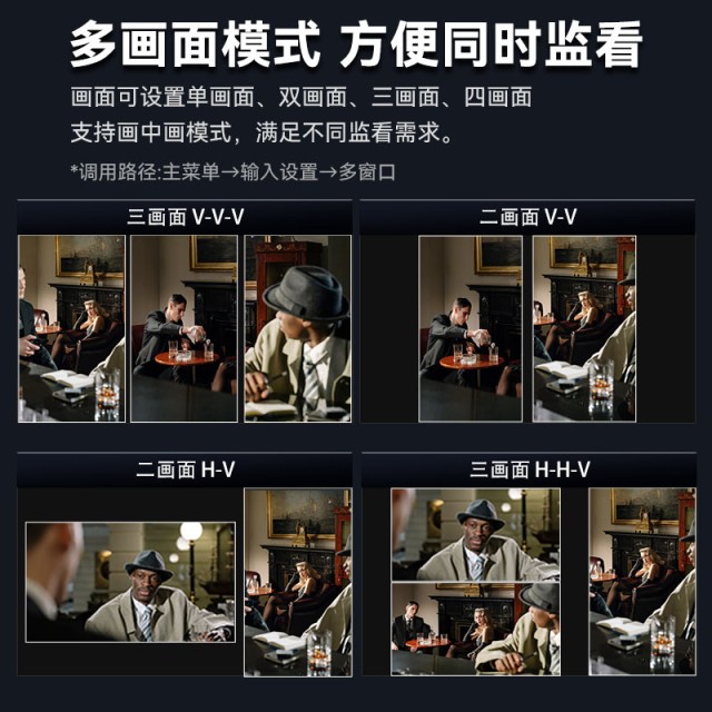 Multi-Screen-Modus Der Bildschirm kann auf Einzel-, Doppel-, Dreifach- oder Vierfachbildschirm eingestellt werden und unterstützt den Bild-im-Bild-Modus, um unterschiedliche Überwachungsanforderungen zu erfüllen.