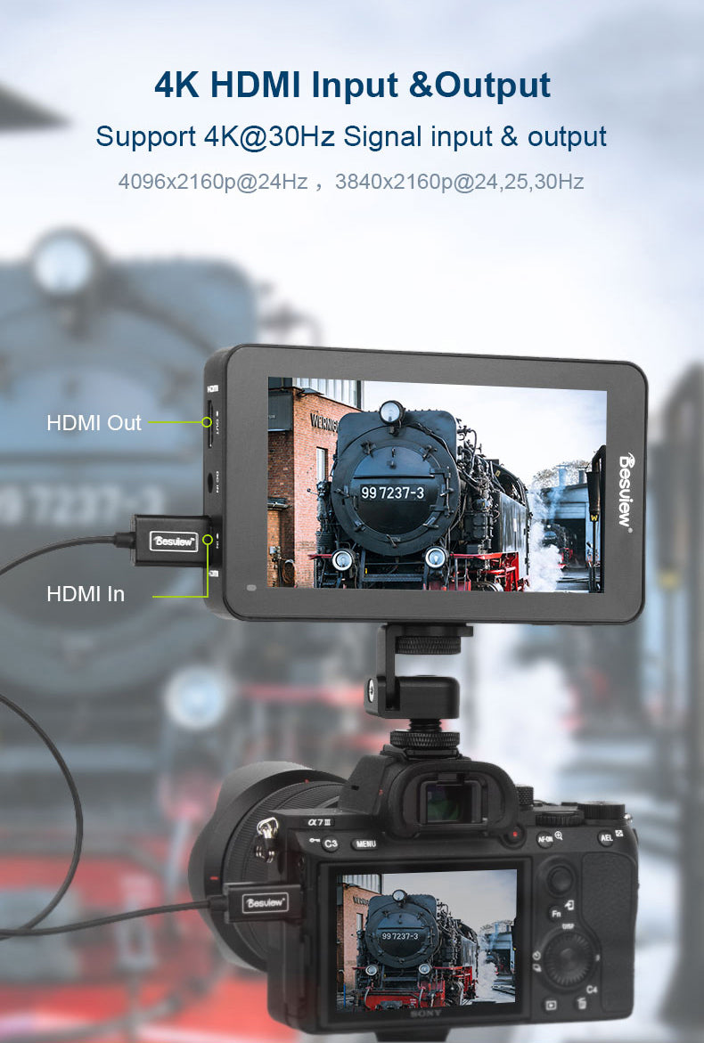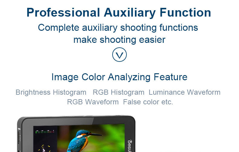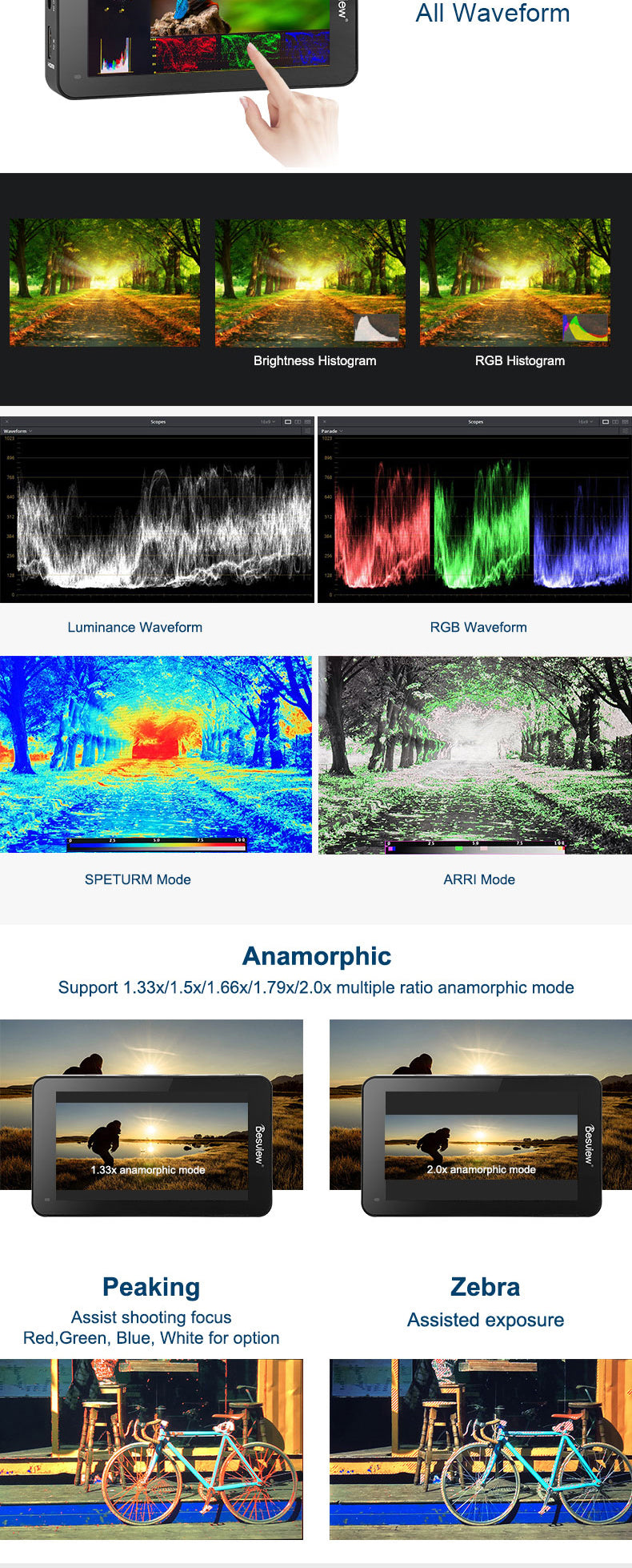 • Ausgestattet mit professionellen Zusatzfunktionen wie Histogramm, Wellenform, Vektorskop, Falschfarben, Peaking, etc;