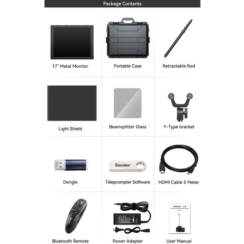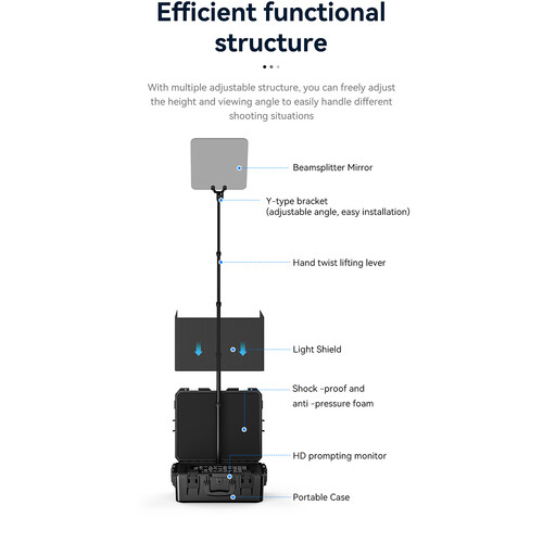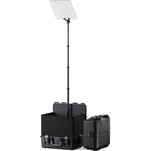 Eine höhenverstellbare Stange (1,5 bis 5,5 Fuß) ermöglicht eine individuelle Positionierung für unterschiedliche Aufnahmeumgebungen. Der Hartschalenkoffer dient gleichzeitig als Ständer und bietet so Mobilität und Stabilität für Produktionen unterwegs. Die mitgelieferte Bluetooth-Fernbedienung sorgt für eine kabellose Skriptsteuerung, und die Sonnenblende minimiert die Blendung, so dass auch bei hellem Licht eine gute Lesbarkeit gewährleistet ist.