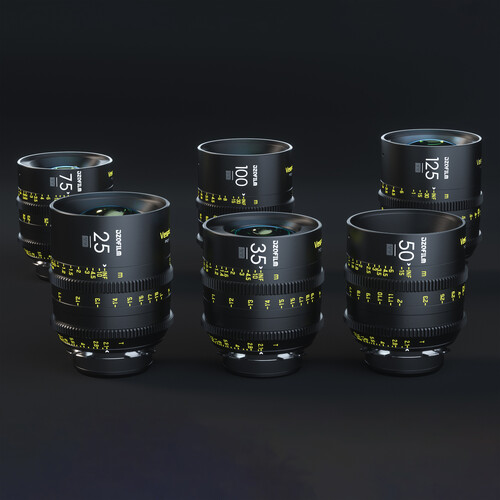 Das DZOFilm VESPID 6-Objektiv-Kit A eignet sich für Produktionen vom Independent- bis zum Studiofilm. Die enthaltenen 25-, 35-, 50-, 75-, 100- und 125-mm-Objektive mit PL-Mount-Anschluss und die enthaltenen EF-Mount-Objektive decken Vollformatsensoren ab und projizieren einen Bildkreis von 46,5 mm, sind jedoch klein und leicht, was sie zu einer ausgezeichneten Wahl für Handheld-, Gimbal- und Drohnenaufnahmen macht.