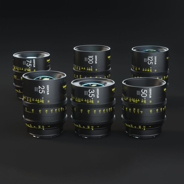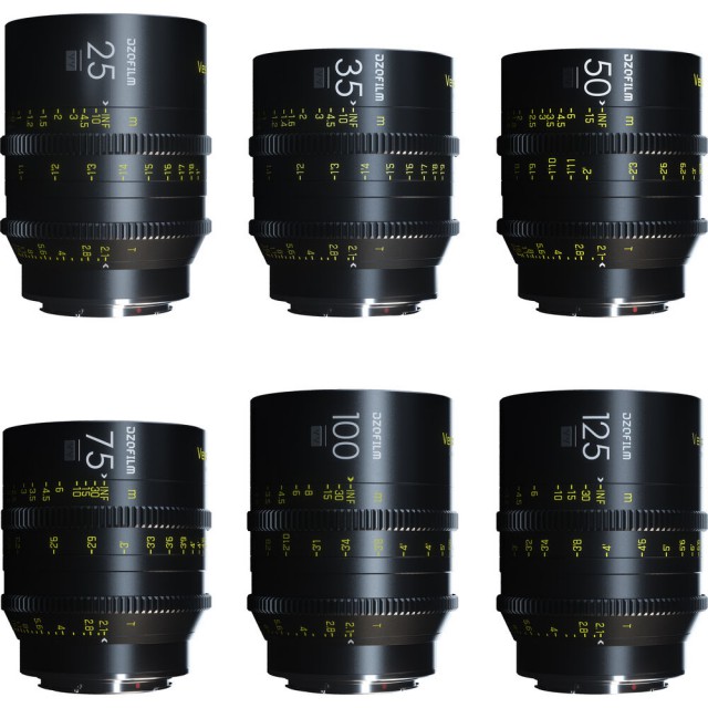Das Set von 6 manuellen Objektiven der DZOFilm VESPID-Serie mit (austauschbarem) EF-Anschluss umfasst Modelle mit Brennweiten von 25, 35, 50, 75, 100 und 125 mm und einer Blende von T2.1. Das Design der Objektive ist auf Videoaufnahmen zugeschnitten: Es garantiert ein minimales "Atmen", die Drehung der Objektivvorderseite und die Veränderung ihrer Größe während der Fokussierung werden vermieden, und die gleiche Position der Fokus- und Blendenringe gewährleistet einen einfachen Objektivwechsel im Rig. Das Set enthält außerdem einen stabilen Tragekoffer.