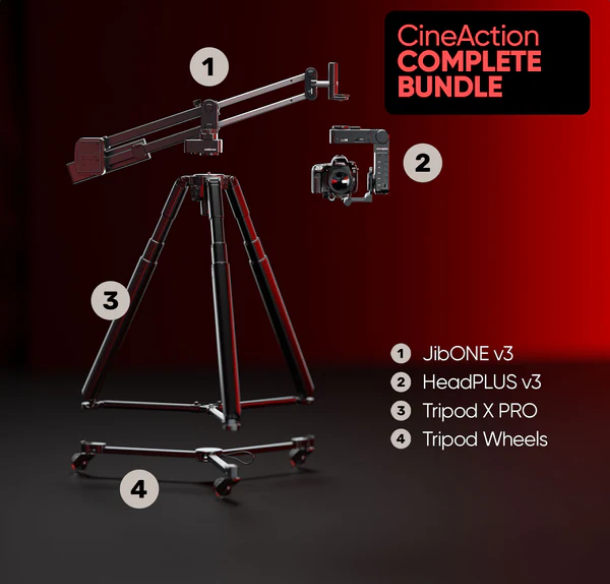 Das Edelkrone CineAction Bundle - Complete kombiniert den JibONE v3, den HeadPLUS v3, das Tripod X PRO und die Tripod Wheels und bietet damit eine All-in-One-Lösung für reibungslose, professionelle Filmaufnahmen mit präziser Bewegungskontrolle.