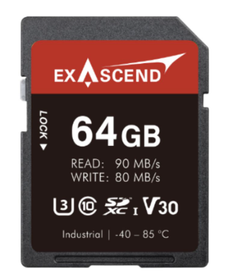 Die Exascend EX64GSDV30-IDE ist eine industrielle SD-Karte (SD300-Serie) mit 64 GB Speicherplatz und 3D-TLC-/pSLC-NAND-Technologie, die Lesegeschwindigkeiten von bis zu 90 MB/s und Schreibgeschwindigkeiten von bis zu 80 MB/s bietet. Mit den Spezifikationen V30/U3/C10/A2 arbeitet sie bei Temperaturen von -40 °C bis +85 °C mit SMART-Zustandsüberwachung, einer MTBF von 2.000.000 Stunden und einer Eingangsspannung von 2,7–3,6 V – ideal für robuste 4K-Video-, Überwachungs- und Embedded-Systeme.