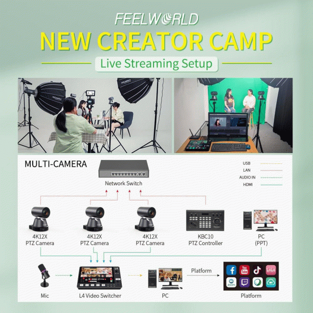 1.Mehrfach-Kamera: Sie können zwei 4K12X für mittlere Live-Streaming, und drei 4K12X für große Live-Streaming verwenden. Verwenden Sie mit FEELWORLD L2 PLUS Video-Switcher, kann in Echtzeit zu überwachen und PC anschließen, um PPT spielen.