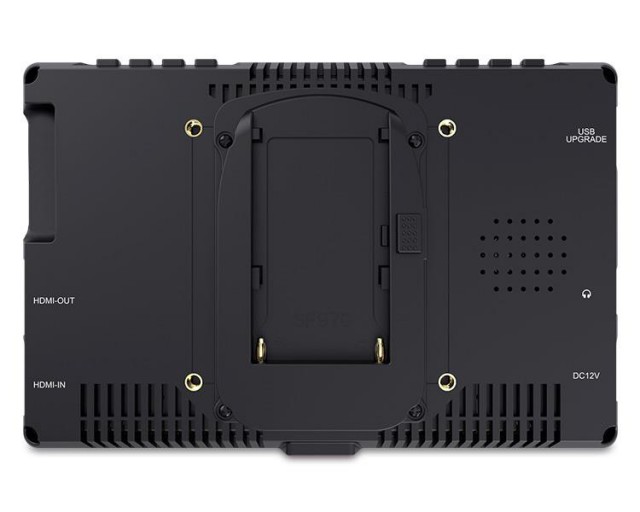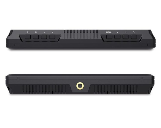 ...erfolgen über Tasten am oberen Rand des Displays, darunter auch Funktionstasten, die mit beliebigen Funktionen belegt werden können, z.B. Schärfehilfe, Falschfarbendarstellung, etc. An der Unterseite befindet sich ein 1/4"-20-Standardgewinde für die Montage des Monitors an DSLR/DSLM/Kamera-Rigs oder direkt an Kameras mit dem (im Lieferumfang enthaltenen) Blitzsockelreduzierer, und die Rückseite verfügt über VESA-Standardgewinde mit 75 mm Abstand
