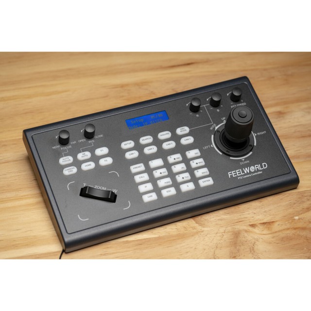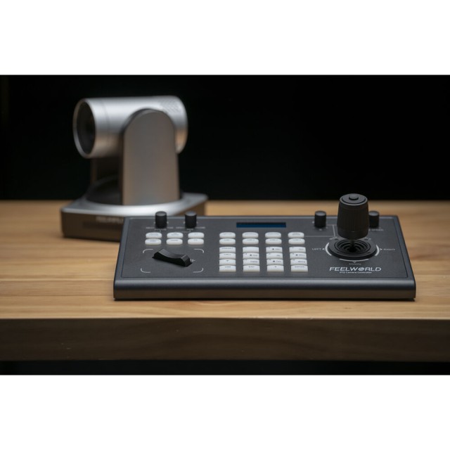 Der KBC10 PTZ-Kamera-Controller mit Joystick von FeelWorld ist mit jeder PTZ-Kamera kompatibel, die die seriellen Protokolle ONVIF, IP VISCA, VISCA und Pelco-D/P verwendet. Es kann über Ethernet, RS-232 DB-9 und RS-422 5-pin Terminal Ports eingerichtet werden, um bis zu 255 Kameras zu steuern. Er kann Kameras über Twisted-Pair-Kabel aus einer Entfernung von bis zu 1200 Metern steuern.